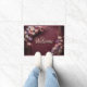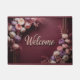 Deze glamoureuze bordeauxrubberen deurmat heeft bloemstukken. Linksboven stroomt een tros roze, lavendel en rozen goudbloemen naar beneden en rechtsonder een spiegelopstelling creëer. Gecentreerd tussen de bloemgroepen, verschijnt het woord Welkom in klassieke rozen gouden letters, waardoor een gastvrij brandpunt ontstaat. Verspreide verlichting benadrukt de rijke textuur van de achtergrond en de glinstering van de bloemaccenten.
