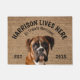 Boxer Gepersonaliseerd Hondenliefhebber welkom model. Deze welkome mat kan met de naam van uw hond worden gepersonaliseerd, kan de slogan ook worden veranderd of u kon een afbeelding van uw eigen hond gebruiken (zorg ervoor het transparant is). De tekst luidt: Theodore leeft hier... Alle behandelings verwelkomen uitgeven het ontwerp om doopvont, kleuren en achtergrondkleur te veranderen. Wanneer het vervangen van het afbeelding van uw hond, gebruik een transparant afbeelding. Het maakt een prachtig cadeau voor een huisopwarmingsfeest, feestdagen, hondenliefhebbers en zo vaak als het maar gebeurt.