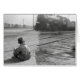Een kleine jongen zit langs de spoorwegen, terwijl hij treinen langs ziet passeren. Minneapolis, Minnesota. 1939.