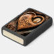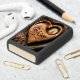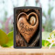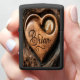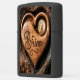 Een houten hartsnijwerk van een wolf die huilt op de maan, met de naam Brian hieronder. Het hart rust tegen een verweerde boomstam.