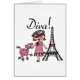 Diva T-shirts, lijfpakken, mokken, tassen, kaarten, stickers, sleutelkettingen, kussens, wandklokken en nog veel meer met een schattig diva-ontwerp met een bruin meisje in een pet en een roze jurk met haar roze poodle bij de Eiffeltoren!