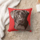 Dit kussen kenmerkt mijn tekening van een chocoladebruin, Labrador Retriever, tegen een felrode achtergrond
