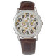 Dit mannen horloge heeft een modern ontwerp uit het midden van de eeuw van concentrische cirkels in goud, groen en bruin op een witte achtergrond.