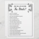 Wil je niet je eigen bruidsfeestspellen afdrukken? Gebruik deze flyers met bewerkbare vragen. Bestel de gewenste hoeveelheid; Bruidsfeestspel "Hoe goed ken je de bruid?" met bewerkbare vragen. Ik raad aan om je vragen in een teksteditor zoals notepad of word te typen en ze vervolgens te kopiëren en in dit tekstveld te plakken. Dubbele spatie tussen vragen en gebruik hoofdletters voor deze "look". Je kunt ook de kleur van de flyer aanpassen aan je bruidsfeest met behulp van de achtergrondkleuren en het pipetgereedschap. Een versie met vaste vragen is hier ook beschikbaar: