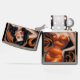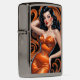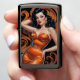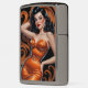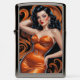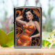 De illustratie met de titel Brunette Pin-Up Oranje Dress geeft een klassieke pin-up art stijl weer met een eigentijdse twist. Het beschikt over een brunette vrouw met lang, golvend zwart haar dat herfsten over haar schouders in zacht, volumineuze krullen. Ze is gekleed in een opvallende, strapless oranje jurk met een glanzende, bijna latexachtige textuur die haar figuur omhelst, met de nadruk op haar rondingen. De jurk is gedetailleerd met een grote boog op de borst en een oogverblindende, met diamanten ingelegde riemgesp in de taille, waardoor een vleugje sophisticatie wordt toegevoegd aan de gedurfde look. Haar pose straalt vertrouwen uit: de ene hand rust op haar heup, terwijl de andere boven haar hoofd wordt opgeheven, waardoor een ontspannen maar verleidelijke houding ontstaat. Ze heeft accessoires met elegante, bungelende diamanten oorbellen, en haar nagels zijn geschilderd in een levendige rode kleur, die overeenkomt met de algehele glamoureuze sfeer. De achtergrond is diep zwart, versierd met wervelende, oranje patronen die de kleur van haar jurk weerspiegelen, waardoor het dramatische en gevoel van het stuk wordt versterkt. De combinatie van de rijke kleuren, ingewikkelde details en klassieke pin-up pose maakt deze illustratie een boeiende weergave van retro glamour.