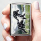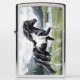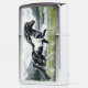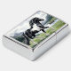 Brana at a different angle, she was a silver black pinto but painted her as black and white Icelandic horse that walks across a grassy field, with a serene backdrop of mountains and a river. A Viking ship is docked near a rustic cabin.