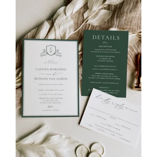 BRUNSWICK CREST, huwelijksprogramma. Kenmerken, elegante groene typografie en botanisch groen en bloemig versierde kam aan de voorkant met witte typografie en groene achtergrondkleur aan de achterkant.