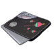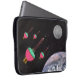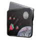Een vakantieruimtefantasie met luchtbellerende lichte ruimteschepen die de aarde omringen met de maan op afstand en een sterrenhemelachtergrond.