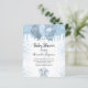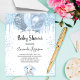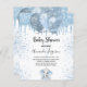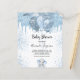 Voor een baby shower, om een baby te vieren. Een witte achtergrond. Verkleurd met blauwe faux glitterdruppels, verfdruppelende blik, ballonnen en een schattige kleine baby olifant jongen. Pas de naam van de moeder aan de naam en partijdetails aan en voeg deze toe. De naam en de tekst: Baby shower wordt geschreven met een handgeschreven stijlscript met letters