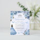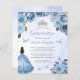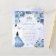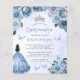 Deze mooie quinceañera-uitnodiging heeft een rand van blauwe rozen met zilveren namaak glinsterend gebladerte op een blauwe waterverf achtergrond. Een zilveren tiara, een donkerharig meisje in een blauwe prinsessenjurk en kleine blauwe vlinders versieren de tekst. Het woord "Quinceañera" en de naam van de eregast komen voor in elegant blauw handgeschreven schrift, met de overige tekst in grijs schreefloos lettertype. Voeg extra tekst toe op de achterzijde, samen met een QR-code om uw gasten te helpen uw quinceañera-website te bezoeken en online te reageren.