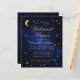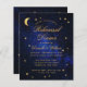 Een budget repetitie diner uitnodiging voor een hemelse bruiloft thema, met de maan en ster op een sterrennacht blauwe achtergrond. De titel Repetisal Dinner en de namen zijn geschreven in een elegant kalligrafisch script. De maan en de sterren zijn faux gold folie, de tekst is goudkleurig. Op de zwarte, is er alleen de maan en ster op een sterrenblauwe achtergrond. De sterrennachtfoto is gemaakt door Felix Mittermeier van Pixabay en is gratis voor commercieel gebruik.