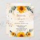 Een witte en gouden watercolor achtergrond versierd met zonnebloemen, eucalyptus groen en gouden bladeren en namaak goud glitterstof. Personaliseer en voeg een naam en feestdetails toe.