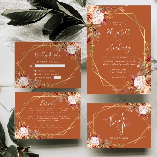 This elegant modern wedding menu features a gold geometric frame decorated with watercolor floral bouquets in autumn colors of burnt orange, peach, burgundy and blush on a burnt orange background. The customizable text combines white whimsical handwriting and copperplate fonts. The reverse side is solid burnt orange.