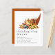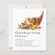 Cornucopia Sunflower Thanksgiving nodigt uit. Een budgetprijs voor KLEINE 4,5 x 5,6 inch. Verkrijgbaar in een SEMI GLOSS 110 lb KAART STOCK dat de standaardoptie is (aanbevolen voor uitnodigingen), OF een SATIN FINISH 80 lb THINER PAPER STOCK (ideaal voor behuizingen). De enveloppen zijn een facultatieve extra en zijn lichtjes groter dan de kaartgrootte. De kopbal is groot in stijlvolle kleine letters met de details onder. Een mooie illustratie van een cornucopie gevuld met zonnebloemen, pompoenen en bessen.