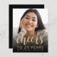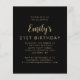 Op de voorkant van deze uitnodiging voor de 21e verjaardag staat de foto van de eregast met een goudkleurige tekstbedekking. Het woord "juichen" verschijnt in elegant goudkleurig kalligrafiescript, gevolgd door "tot 21 jaar" en de naam en verjaardag van de eregast in sans serif lettertype. Een donker scherm helpt de tekst pop te maken. Pas de achterkant aan met de naam en de partijgegevens op een zwarte achtergrond. Een geweldige manier om iemand te vieren die 21 wordt! (LET OP: Enveloppen worden niet automatisch bij deze budgetuitnodiging inbegrepen. Als u enveloppen aan uw bestelling wilt toevoegen, gebruikt u het vervolgkeuzemenu "Enveloppen".)