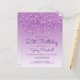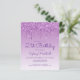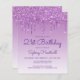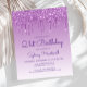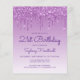 Deze trendy uitnodiging voor een 21ste verjaardagsfeest heeft een glinsterende paarse nep glinsterdruppelrand en een paarse ombre-achtergrond. De woorden "18de verjaardag" en de naam van de eregast staan in een informeel paars handgeschreven schrift, met de rest van de aanpasbare tekst in schreefloos lettertype. Dezelfde paarse glinsterdruppel ontwerpelementen zijn terug te vinden aan de achterzijde.