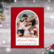 Carte de vacances minimaliste et élégante pour mariage pour les jeunes mariés avec votre photo dans un cadre d'image voûté contre un arrière - plan rouge foncé. Vous pouvez personnaliser l'accueil "Marié & Joyeux" dans un script moderne tendance rouge et votre salutation de vacances, les noms et l'année en simple typographie.
