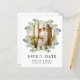Begin uw huwelijksreis met deze prachtig ontworpen save the date-kaart, met een cirkelvormig foto-lijst geaccentueerd door sierlijke gouden ringen en zacht waterverf eucalyptusblad. De combinatie van natuurlijk groen en verfijnde metaaldetails creëer geeft een modern maar toch romantisch gevoel. Voeg de foto van je favoriete paar in het midden toe en personaliseer met je trouwgegevens om een zinvolle en stijlvolle aankondiging te creëer. Een perfecte manier om de toon te zetten voor uw aankomende feest!