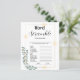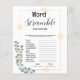 Vermaak je gasten met dit grappige gemeenschappelijke Vrijgezellenfeest Game- Word Scramble. Bridal Word Scramble is een eenvoudig vrijgezellenfeest spel dat gasten van alle leeftijden zullen genieten. Gasten - spelers proberen de trouwgerelateerde woorden zo snel mogelijk te ontwarren. De Kaart is gemaakt als sjabloon, zodat u bestaande "scrambled words" kunt wijzigen Ontwerpfuncties linker hoek groen opgenomen in glanzende rechthoek met groengrijze achtergrond. Eenvoudig en elegant. Deze Vrijgezellenfeest game sjabloon combineert twee verschillende lettertypen voor een meer dynamische look. In hoesje heeft u hulp nodig bij het ontwerpen of het wijzigen van woorden, neem dan gerust contact op met de winkel.