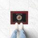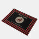 Een buffel geruite silhouet gewei hert ligt in het midden van een geelbruine cirkel op deze aantrekkelijke deurmat. De cirkel is geplaatst op een zwarte achtergrond, die is omlijst met een bijpassende rode en zwarte buffel plaid rand. Uw aangepaste tekst is in bijpassende tan boven en onder de cirkel en herten afbeelding. Perfect voor een hut, boshuis, maar comfortabel thuis in de stad, ook!