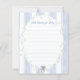 The Predictions for Baby and Baby Well Wishes game features a sweet watercolor clothesline strung across the top, proudly displaying tiny, adorable items, each featuring a cute bunny dressed in blue, with baby prediction questions and a space with advice for the parents to be. The back includes a space for Well Wishes for Baby with a custom hand-painted frame of a crisp blue vertical stripe pattern accented with a lush greenery wreath with a darling blue bow holding a bunch of fresh carrots all rendered in a soft watercolor style. Choose this fun activity which then becomes a special keepsake, every detail is crafted to be saved, tucked away in a baby book, and treasured for you and baby to remember the love of family and friends as he grows.