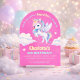 Button to a magical birthday party with an adorable unicorn with wings in the clouds.