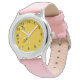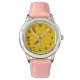 Drie grappige cartoon bijen vliegen op een geweven gele achtergrond omringd door zwarte stippen. Veel plezier met het passeren van de tijd met dit zeer schattige horloge!