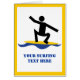 Cadeaux de surf, surfer sur sa planche de surf design cadeau personnalisé avec une icône noire minimaliste d'un surfeur debout sur sa planche de surf jaune sur une vague bleue et une bordure jaune autour. Ce design cool est un modèle et il est entièrement personnalisable. Personnalisez-le et changez le texte avec monogramme, nom ou message. Idées cadeaux parfaites pour le surfeur. Découvrez de nombreux modèles dans notre magasin de cadeaux sportifs.