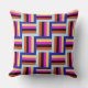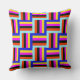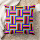 Een gedurfd, contrastrijk geometrisch patroon dat is opgebouwd uit herhalende gestreepte vierkanten in levendige tinten van rood, geel, magenta, sinaasappel en zwart. Elk blok wisselt af tussen horizontale en verticale strepen, omlijst door sterke blauwe randen tegen een hemelsblauwe achtergrond. De lay-out creëer een geweven, bijna optisch-illusie effect, alsof het patroon in elkaar grijpt in een ritmische dans van kleur en orde. Het is speels, luid en onmogelijk om te negeren.