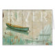 © Daphne Brissonnet / Wilde Apple. Een afbeelding van een rivier met een witte houten stoel tegenover de rivier. Op het afbeelding is een groen gekleurd vlot zichtbaar.
