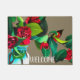Een welkomstmat van bloemenfeest met Camellia bloeit origineel waterverf kunstwerk van kunstenaar Sacha Grossel tegen een aardse, aanpasbare gekleurde achtergrond met welkomstbord. Een huiselijke, lieve welkomstdeurmat perfect voor uw huis.