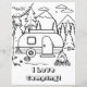 Jolie page de coloriage avec un thème de camping. Un feu de camp et un campeur RV campant dans les bois.