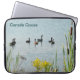Een digitaal schilderij van Canadese ganzen (Branta canadensis) die zwemt met katten (Typha latifolia) en andere vegetatie op de voorgrond. Er verschijnt ook een tekst met de tekst "Canada Goose".