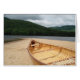 Foto van een kano die in de buurt van een meer in bedekte bosbergen is geslagen.