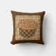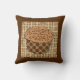 Cupcake met karamelglazuur bedekt met chocoladesproeiers, in een decoratief, chocoladebruin en bruin, polka dot cupcake-wikkel, op een lichtbruin en beige batik patterend achtergrondwerpkussen