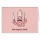Caricature du chef calmar rose avec moustache tenant couteau et fourche à cuisine. Couleur arrière - plan personnalisée. Texte personnalisé.