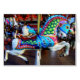 Een carrousel pony met een blauw masker en een blauwe, rode en groene wapenrusting. Dit is een ander paard waarvoor de kinderen renden, vooral de jongens. Dit paard ziet er goed en sterk uit.