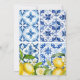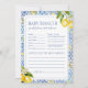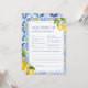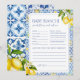 Inspiré par le charme de la côte amalfitaine, cette carte de prédictions et de conseils propose des citrons aquarelles, des motifs de tuiles méditerranéennes et une élégante typographie bleue. Un jeu amusant et élégant pour garder les invités engagés pendant votre douche italienne à thème agrumes.