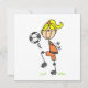 A blond haired girl stick figure soccer player in orange uniform bounces the soccer ball with her knee on soccer player T-shirts, hoodies, mugs, magnets, cards, stickers, bags, morts, keepsakes, pillows, and other soccer apparel and toxits.
