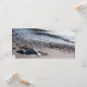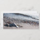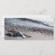 Close up photo of a little wave hitting the beach over seaweed and sand. Out of focus stones in the forground.