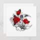Contour, lune de croissant mécanique avec des engrenages, décoré de roses rouges avec des tiges noires spirées et feuilles sur arrière - plan blanc. Steampunk
