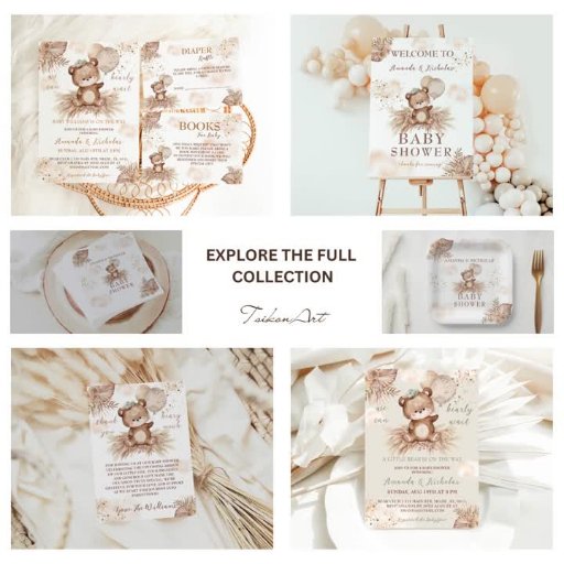 Cette carte de demande de baby shower boho, mignonne, neutre pour les deux sexes, présente un mélange d'accents rustiques vintages dans des couleurs chaudes pastel comme le beige, l'ivoire, le vert et le marron. Un adorable ours en peluche, des nuages, de l'herbe pampa, des feuilles de palmiers et des fleurs créent une atmosphère cosy et accueillante. N'oubliez pas d'explorer la collection complète !