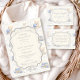 A sweet vintage-inspired design featuring delicate blue bows, soft striped detailing, and charming blueberry garden illustrations. Toile-style artwork with adorable animals and fruit baskets creates a classic storybook feel in a soft powder blue palette. The ornate central frame adds elegance while keeping the overall look light, refined, and timeless. Perfect for a baby shower with a gentle garden theme and a touch of traditional charm.