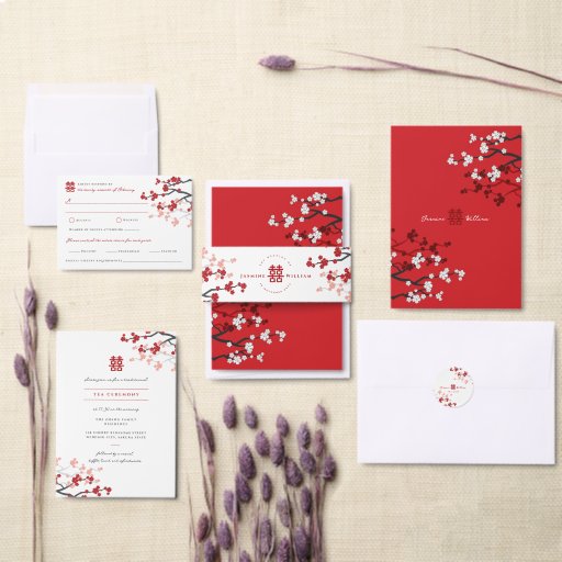 Carte D'accompagnement Cherry Blossoms & Double Bonheur Mariage chinois