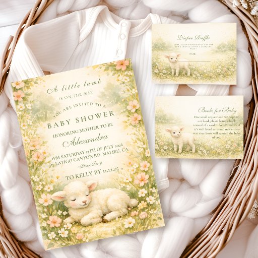 A soft vintage-inspired design featuring a sleeping lamb surrounded by a delicate oval wreath of ivory and blush meadow flowers. The warm parchment background and muted botanical tones create a classic, romantic look that feels calm and timeless. Perfect for a neutral spring celebration or a sweet garden-themed gathering with a gentle storybook touch.