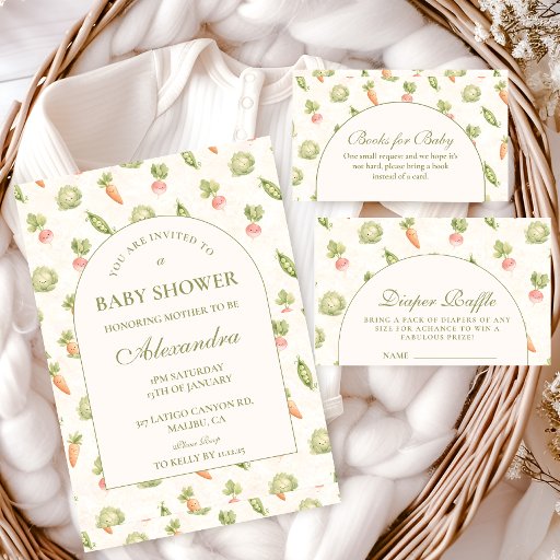 Celebrate a sweet new beginning with this charming little sprout themed design, featuring delicate garden illustrations, soft greenery, and a warm neutral palette. The gentle botanical details and whimsical vegetables create a cozy, storybook-inspired feel that’s perfect for a nature-loving mama-to-be. Designed with a clean arched layout and elegant typography, this piece blends rustic charm with a refined aesthetic. Ideal for spring gatherings, garden parties, or anyone who loves a soft, organic look.