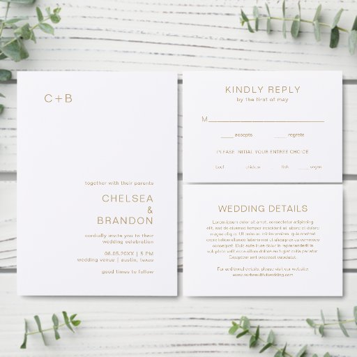 Carte de boîtier Mariage moderne avec une disposition simple et minimaliste. Tous les éléments de conception sont en faux or et peuvent être changés dans l'outil d'édition de conception. Cette carte de boîtier mariage chic au design minimaliste mais élégant va bien avec n'importe quel style de mariage contemporain.