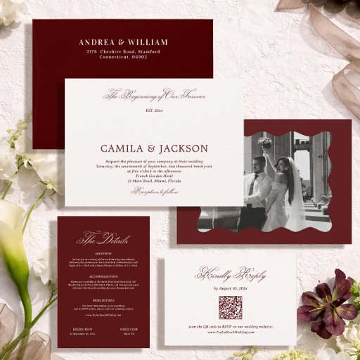 Carte D'accompagnement Modern Ivory and Burgundy Wedding RSVP Qr Code