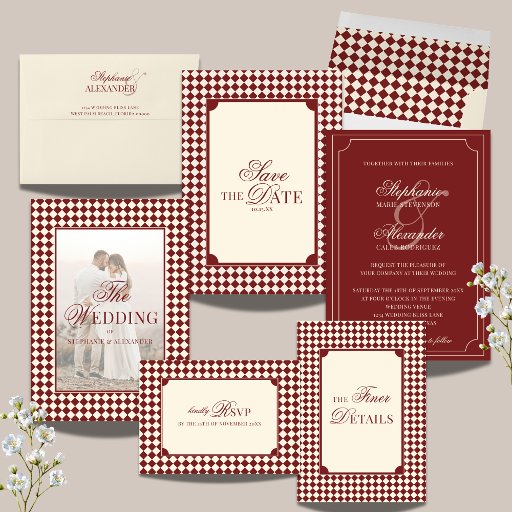 Carte D'accompagnement Old Money Deep Red Ivory Checkered Wedding Details