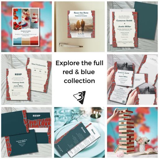 La carte de boîtier de la palette de couleurs Mariage bleu rouge est un ajout informatif à votre faire-part de mariage. Il permet à vos amis et invités de choisir leur tenue mariage pour travailler avec vos couleurs mariages. Ici les feuilles rouges d'automne contre un ciel bleu donnent l'inspiration. Ajoutez votre nom, votre date et vos encouragements ainsi que les images inspirantes. Pour modifier la palette de couleurs, suivez le lien Modifier. Pour plus de thèmes mariages et d'inspiration en matière de planification, visitez le site www.KBMD3signs.com. Pour toute demande de renseignements ou d'assistance sur mesure, contactez-nous à l'adresse info@KBMD3signs.com.